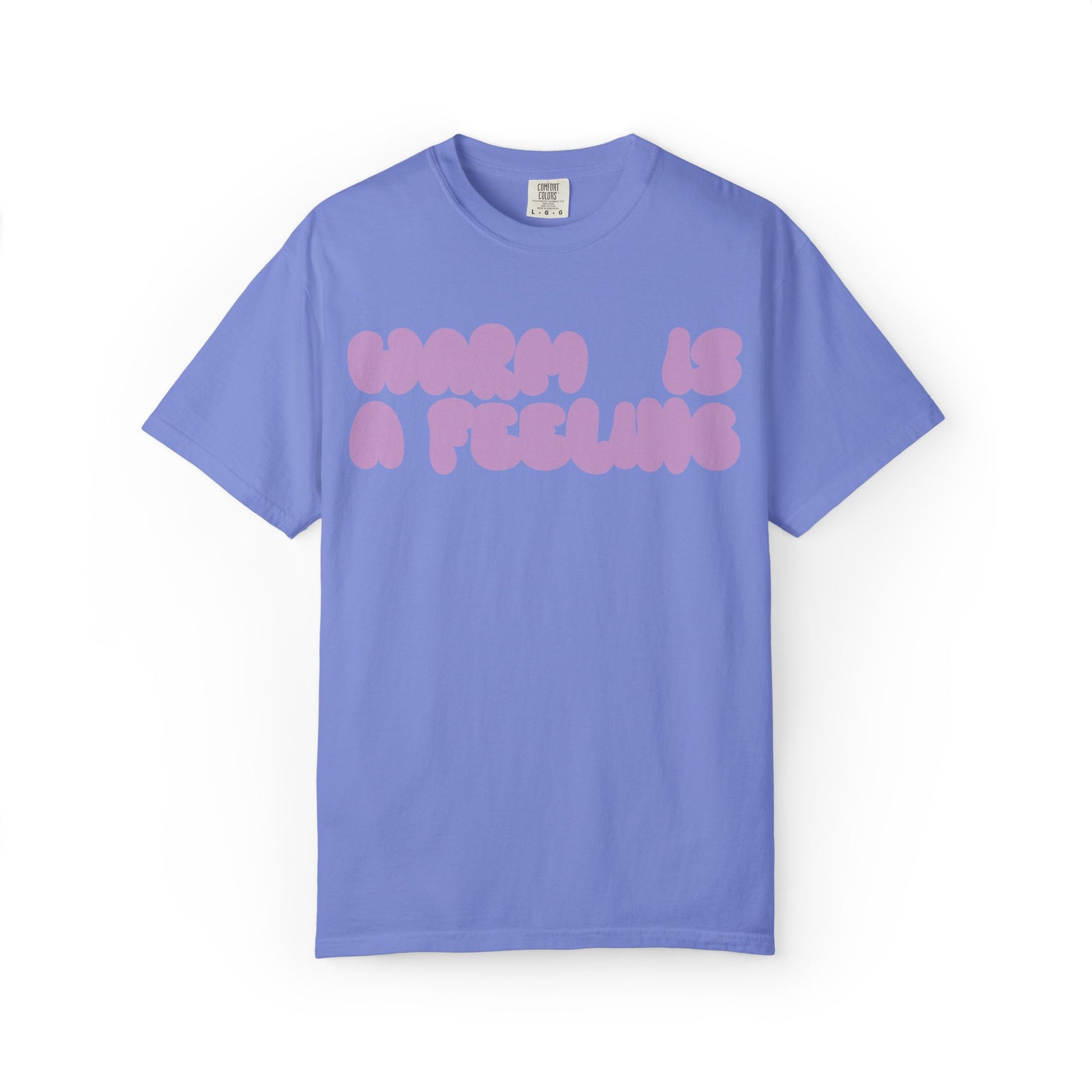 designed for late-night drives, lazy mornings, and everything in between. printed in pink-ish/lavender bubblegum ink on comfort colors® cotton, each tee wears in softer with every wash. the front reads “warm is a feeling” in our signature cloud-gummy font.